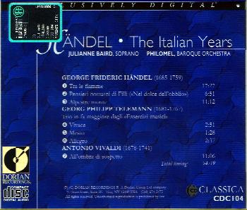 GEORGE FRIDERIC HANDELThe Italian YearsGeorg Philipp Telemann | Antonio VivaldiJulianne Baird, sopranoBaroque OrchestraPhilomel, direttore2000 - CD - Dorian Recordings
